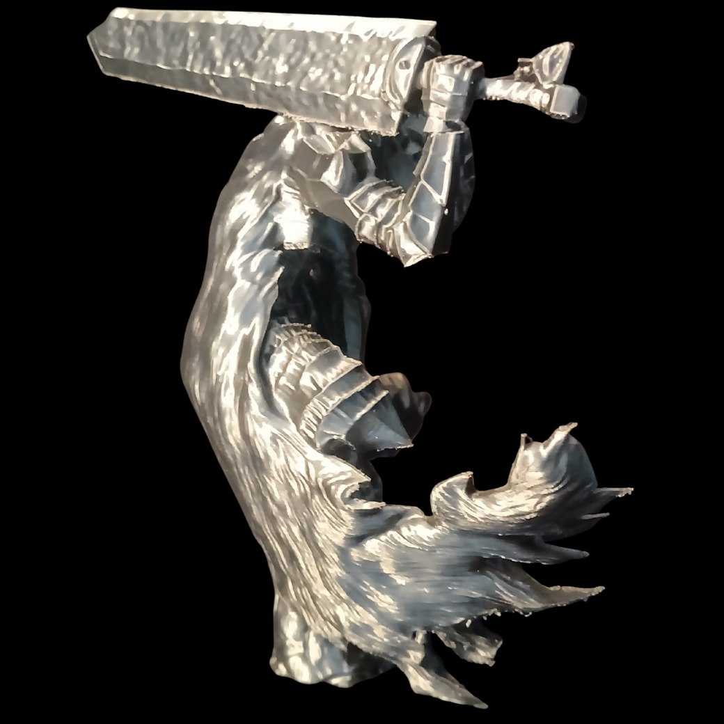 7-inch Berserker Armor Guts figure from Berserk. High-detail 3D printed statue in silky silver PLA. Made in the USA for dark fantasy collectors.